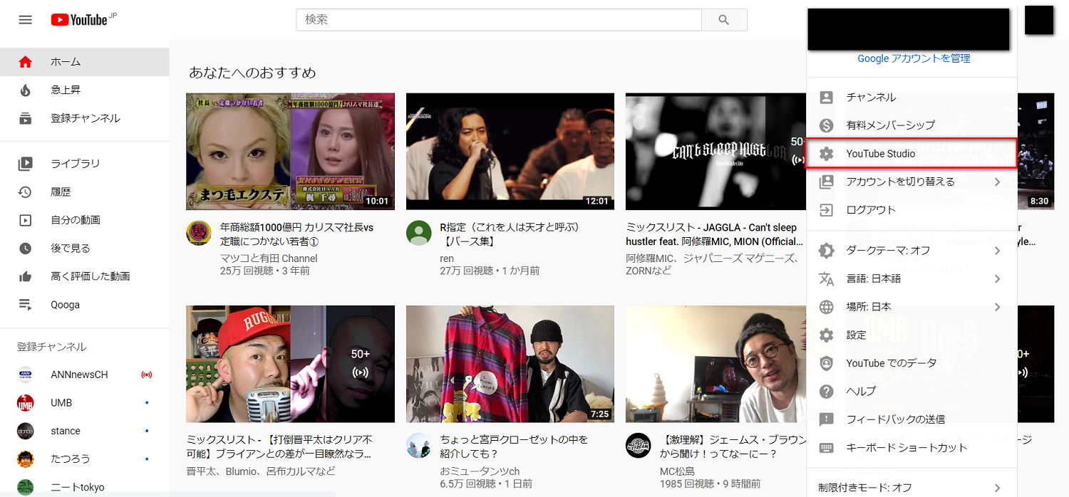 (1)YouTubeホーム画面の右上にあるアカウントをクリックして表示されるメニューから「YouTube studio」を選択する