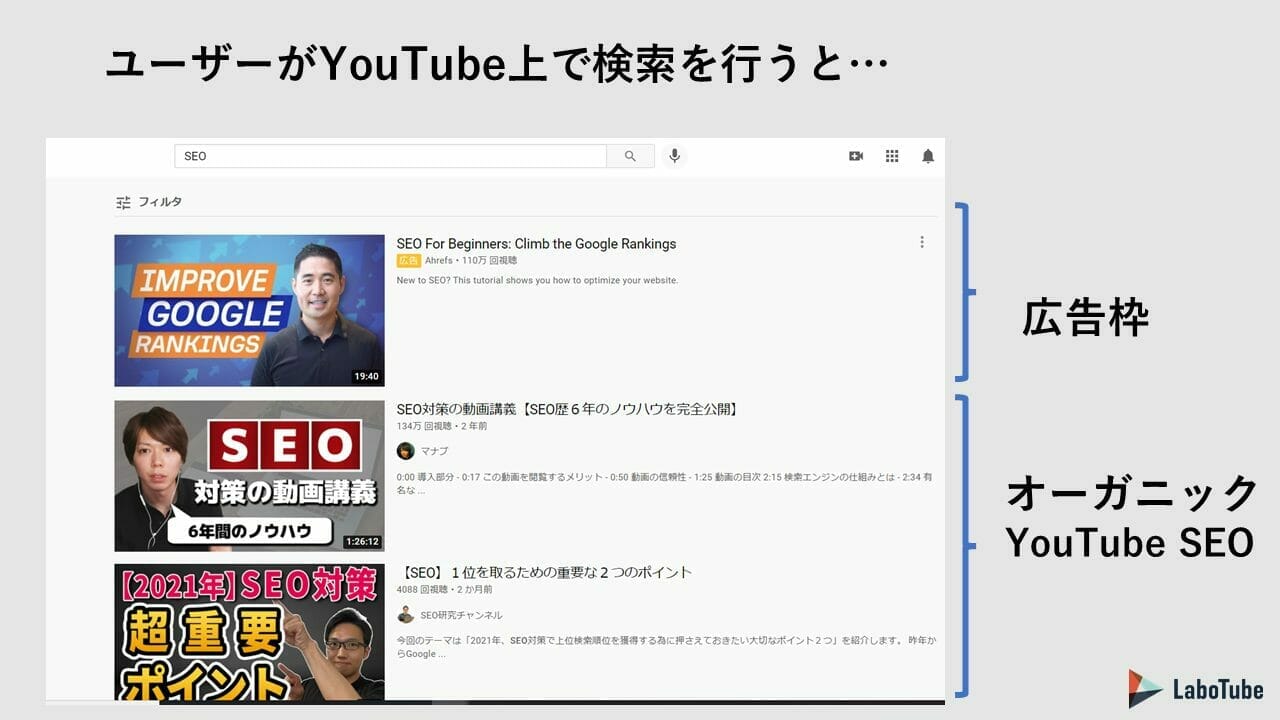 このようなオーガニック領域での検索順位決定のアルゴリズム、あるいは検索順位を向上させる為の施策がYouTube SEOなのです。