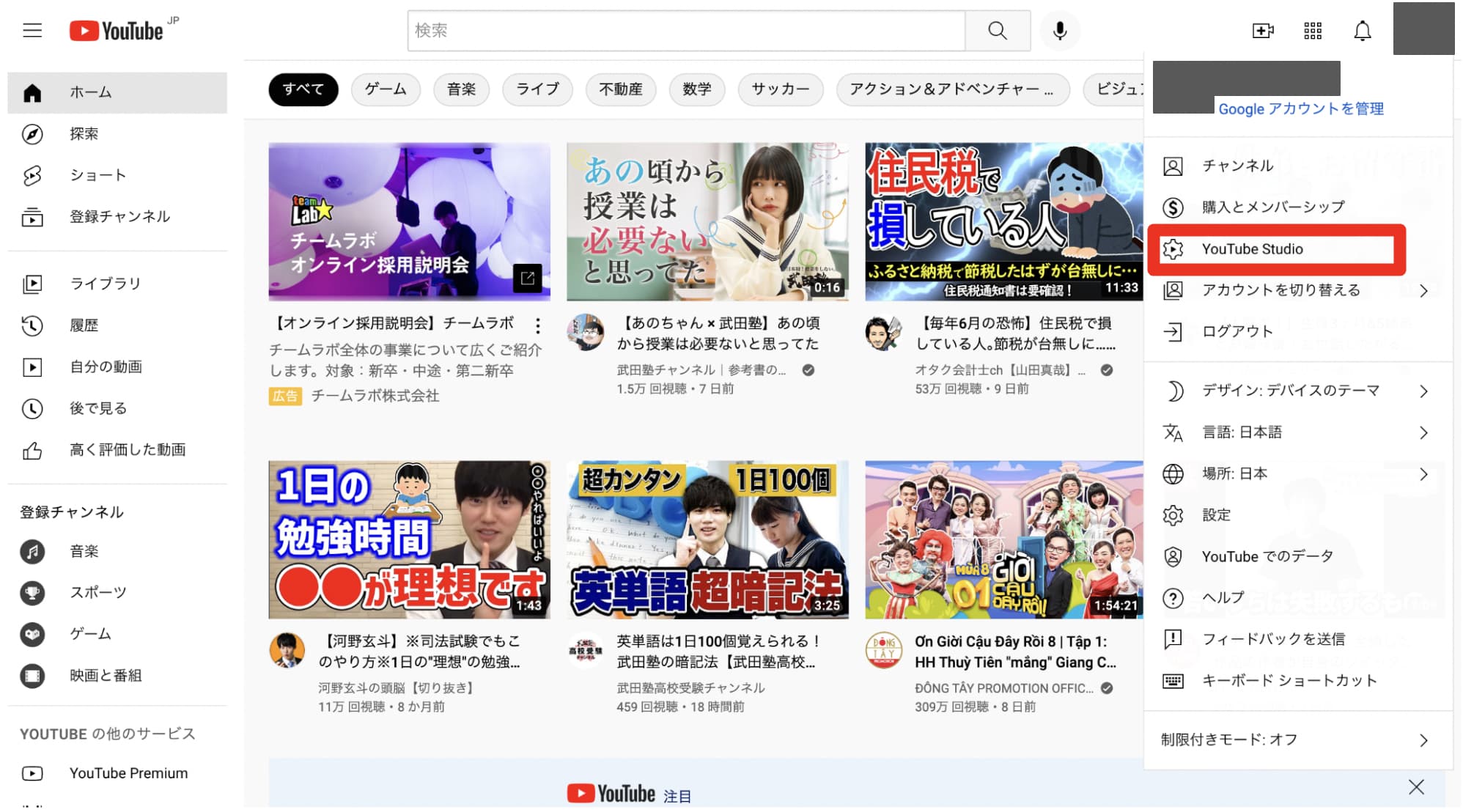 - 右上のアイコンをクリックして「YouTube Studio」を選択