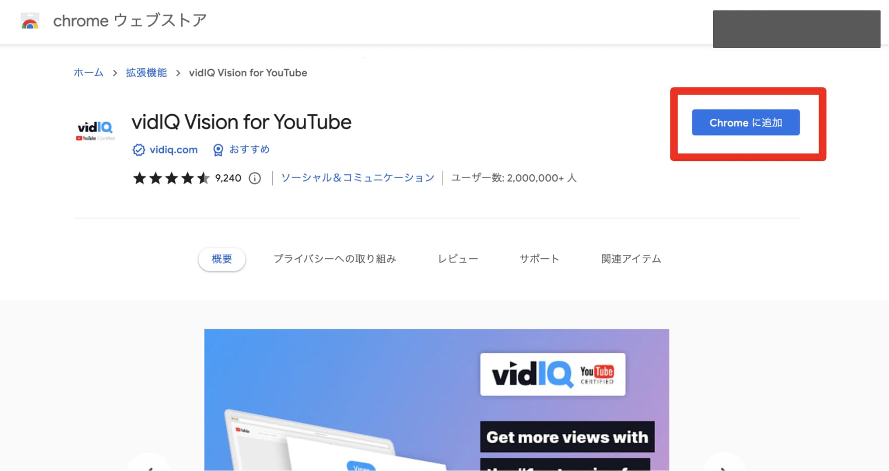 - Google Chromeのウェブストアより「vidIQ」を探し「Chromeに追加」をタップ