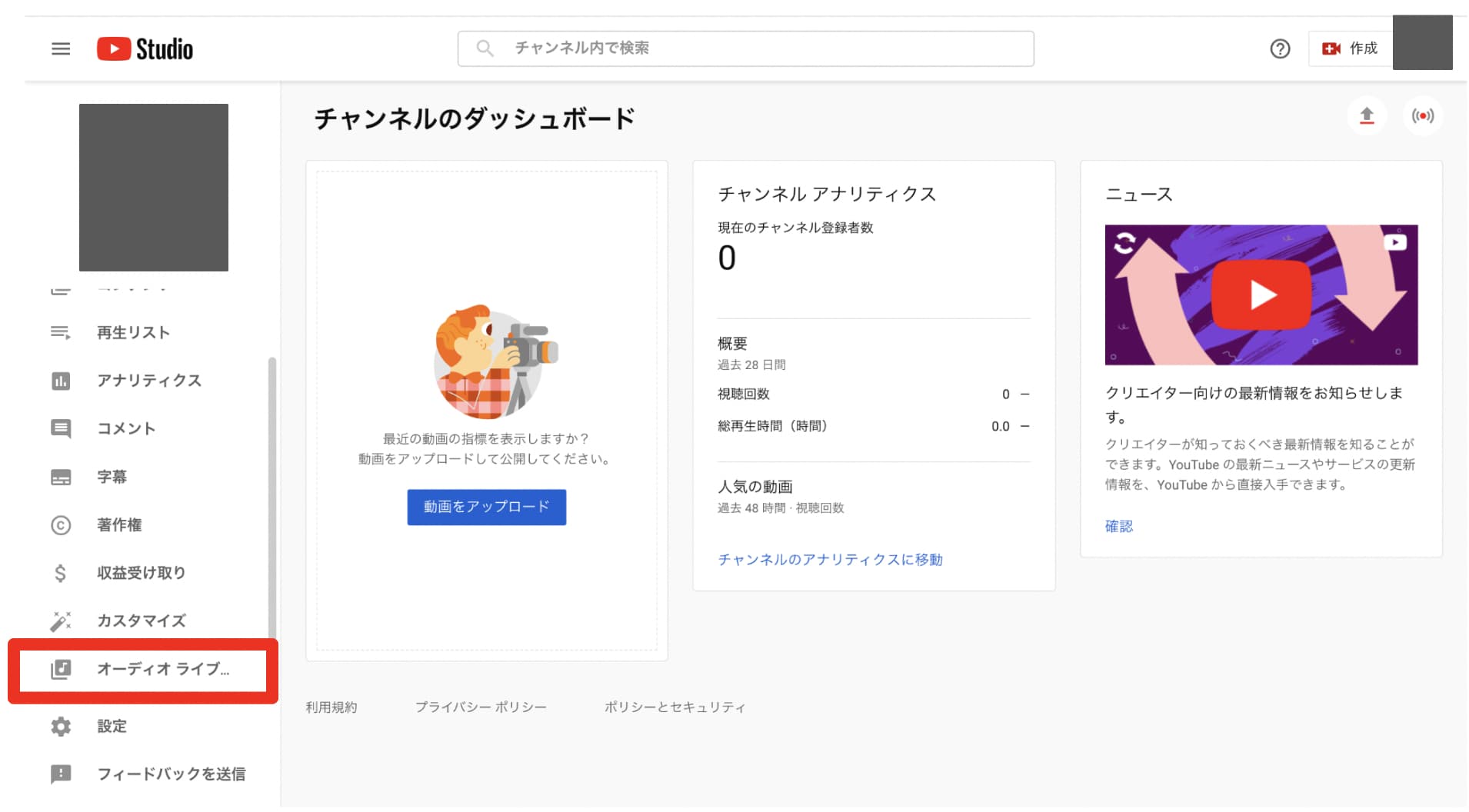 ちなみにYouTubeオーディオライブラリーへは、以下の画像のようにYouTube Studioからアクセスできます。
